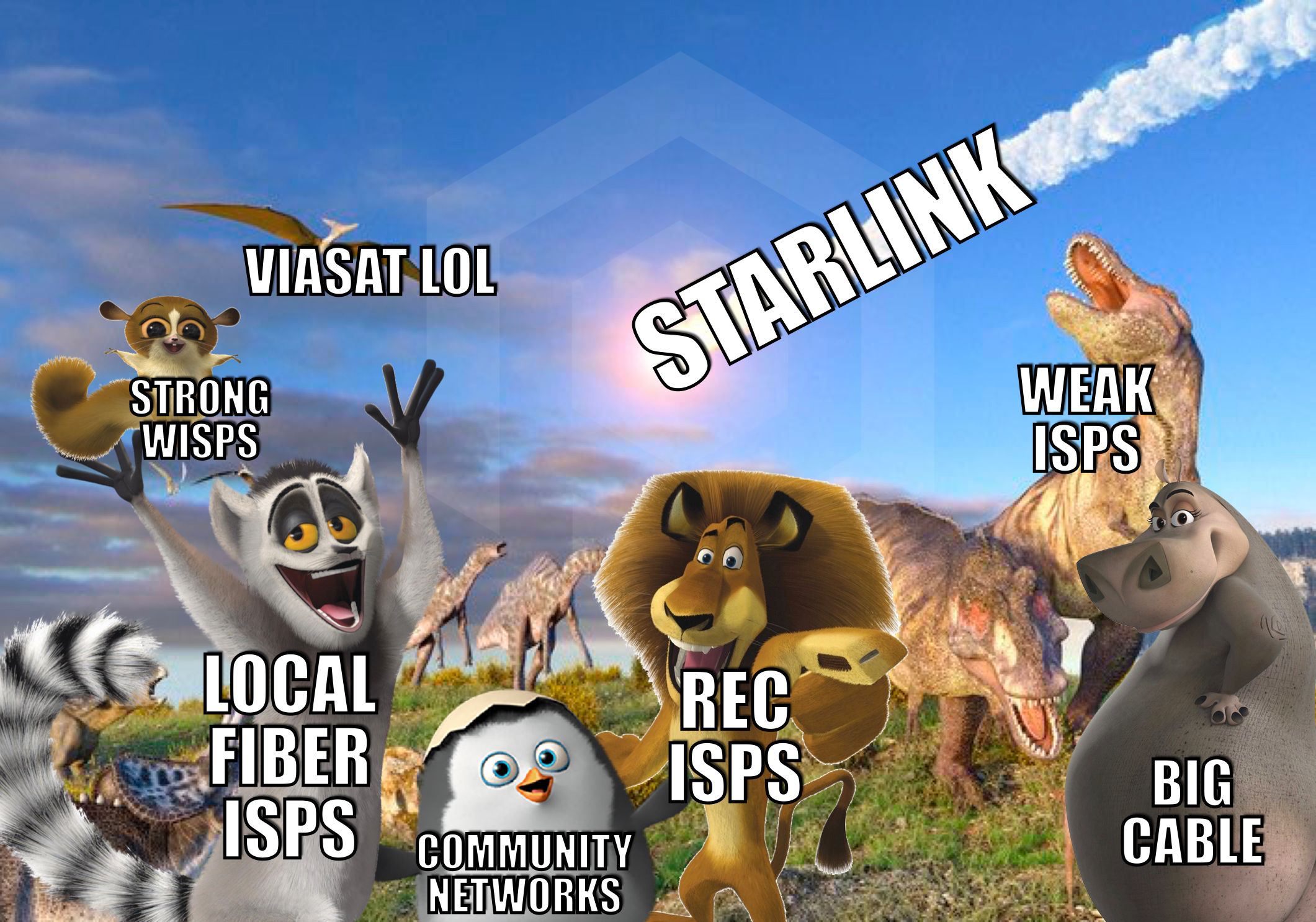 Starlink brings to today’s telecom what Chicxulub Impactor brought to life forms around the time it decided to drop in on Earth. Some unfortunate ISPs are going to die very sudden deaths. Others will die over the coming months and years. Yet thousands of today’s ISPs will carry on, and some among them will thrive.
